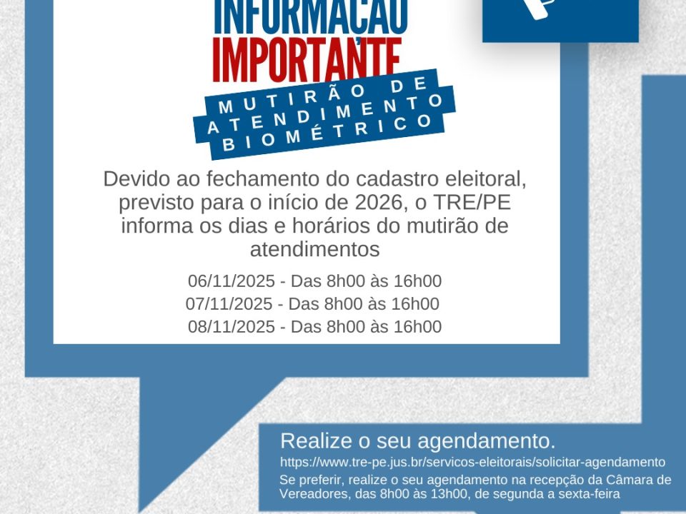 O TRE-PE realizará mutirão de atendimentos biométricos em São Bento do Una, nos dias: