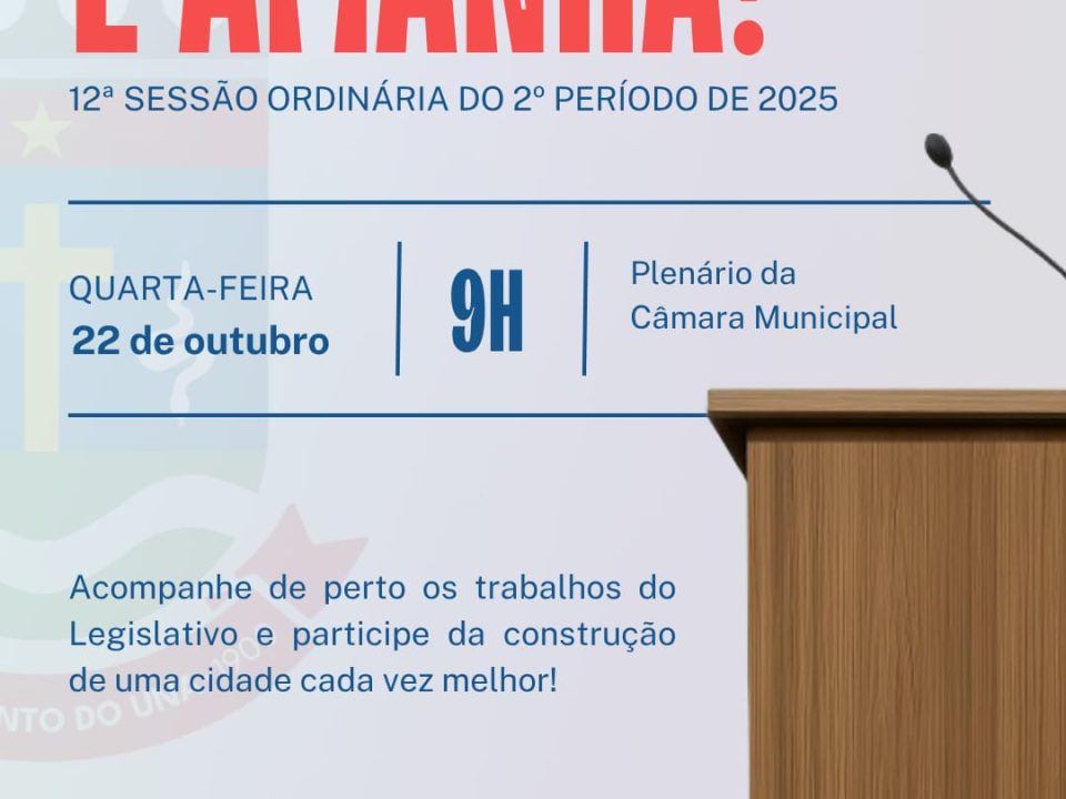 📍 12ª Sessão Ordinária — 2º Período Legislativo de 2025 🗓️ Quarta-feira, 22 de outubro 🕘 9h | Plenário da Câmara Municipal de São Bento do Una