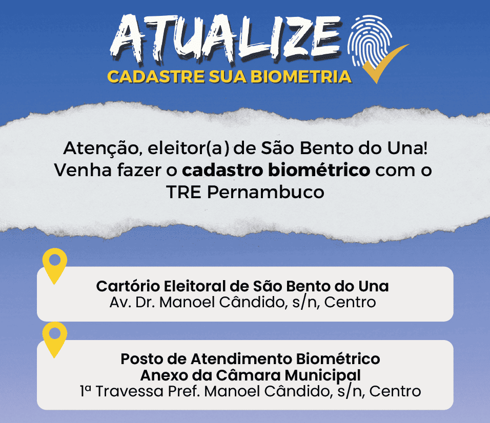 O Tribunal Regional Eleitoral de Pernambuco (TRE-PE), em parceria com a Câmara Municipal de São Bento do Una e o Poder Executivo local, está promovendo o cadastramento biométrico dos eleitores do município de São Bento do Una.