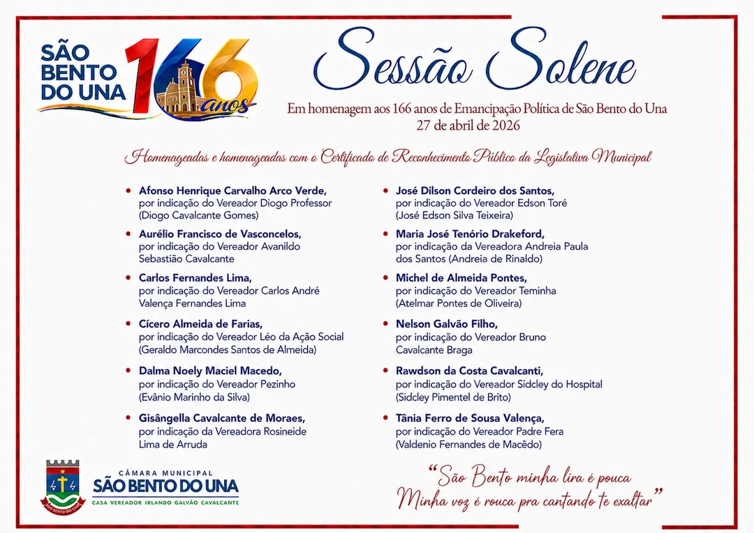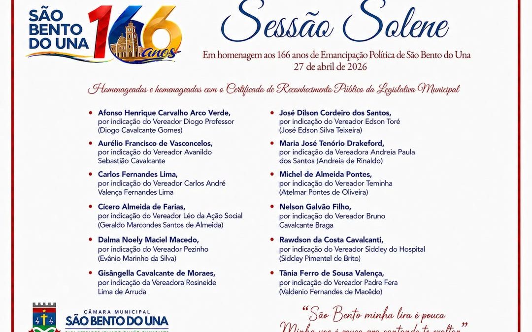 31 de março de 2026São Bento do Una (PE) – A Câmara Municipal realizou nesta segunda-feira, 27 de abril de 2026, a segunda edição da Sessão Solene em comemoração à Emancipação Política do município, celebrando os 166 anos de história de São Bento do Una. O evento reuniu vereadores, autoridades do poder executivo, judiciário e militar, além de um numeroso público que lotou – e até extrapolou – o espaço do plenário, reforçando o caráter popular e emocionante da noite.