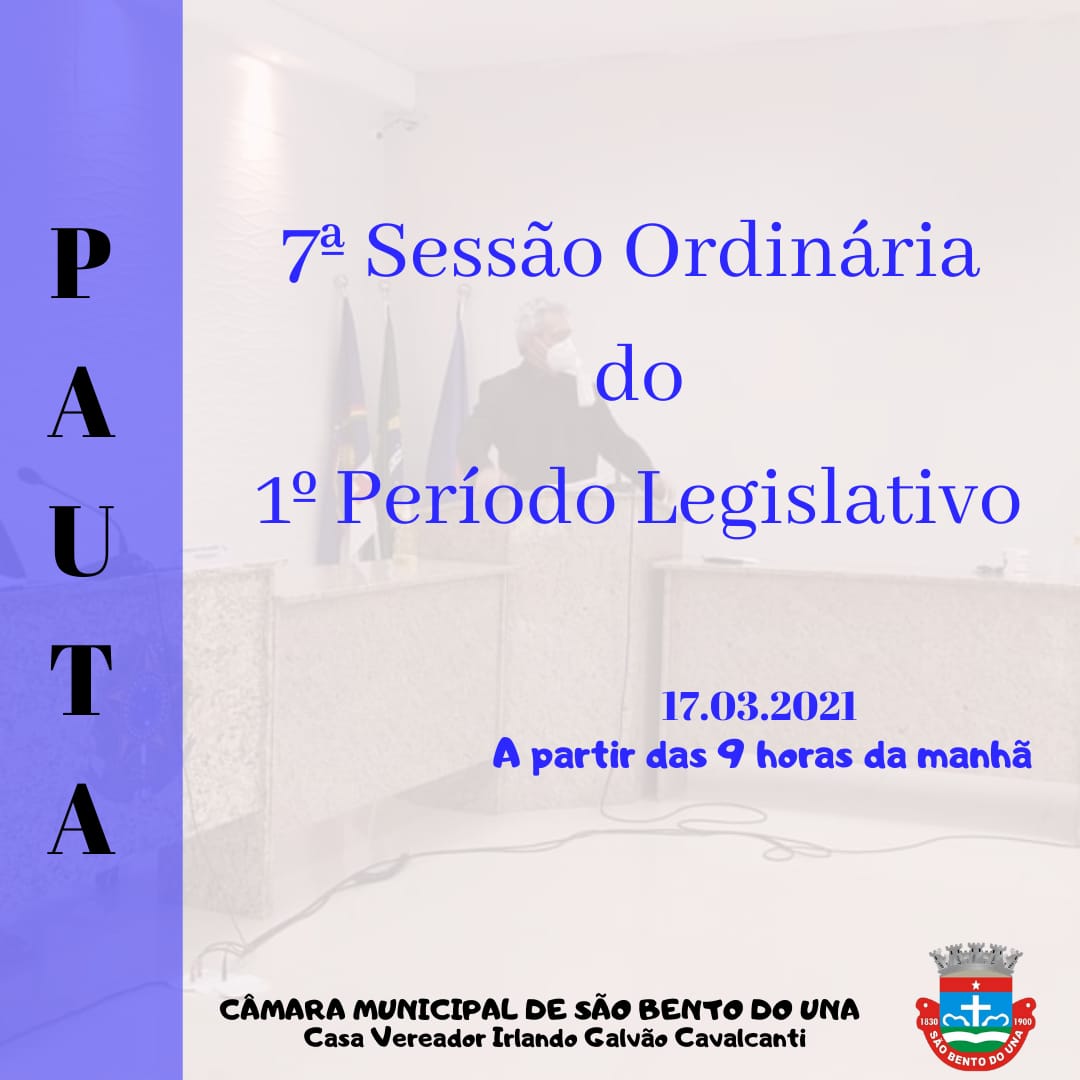 18 de março de 2021Na próxima quarta-feira, dia 17 de março de 2021, a partir das 9 horas da manhã acontecerá a 7ª Sessão Ordinária do 1º Período Legislativo de 2021.